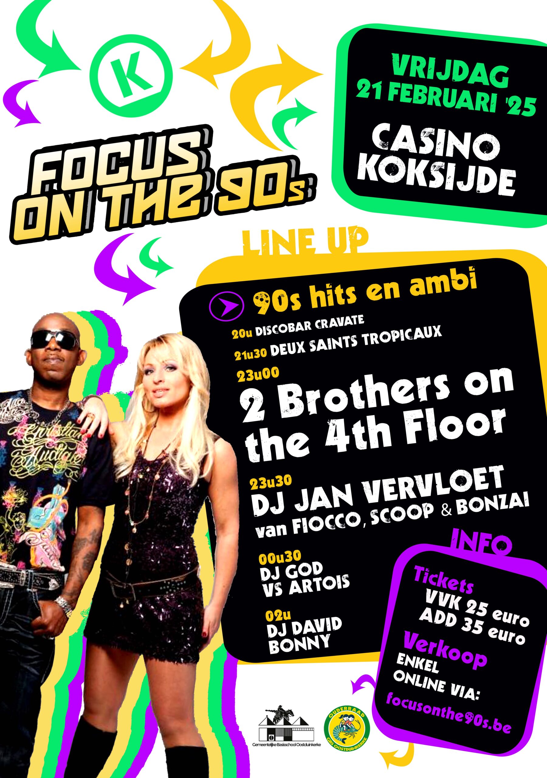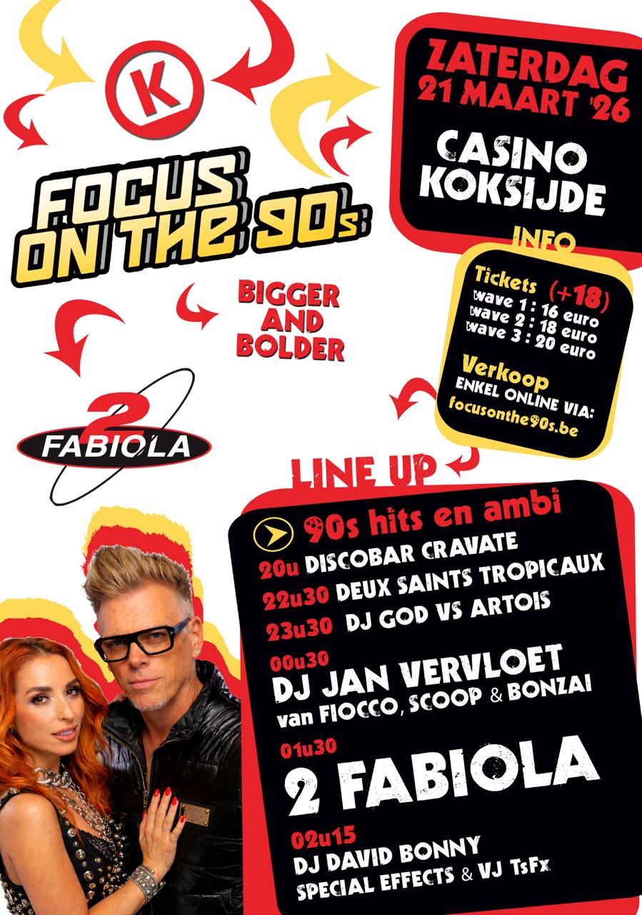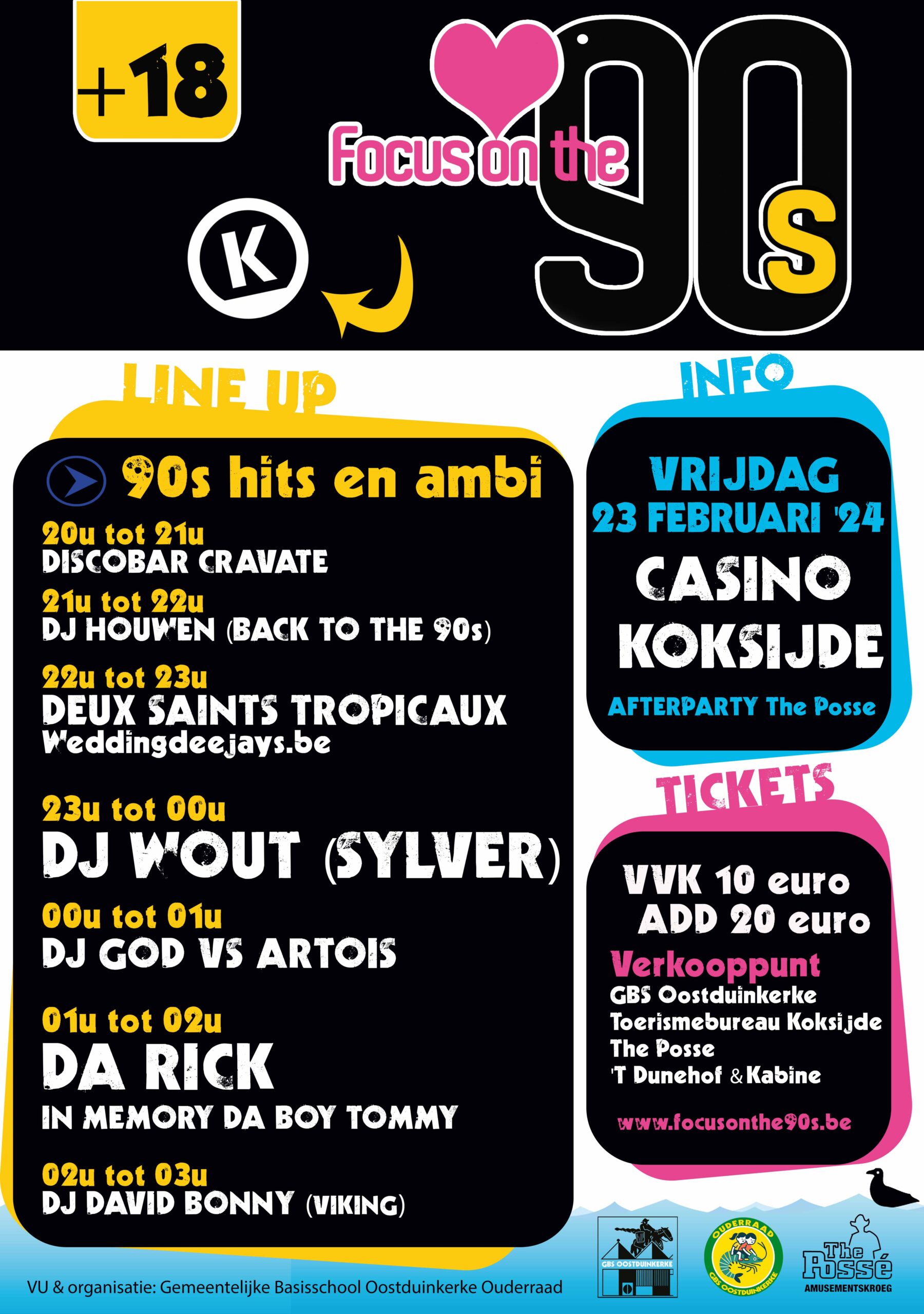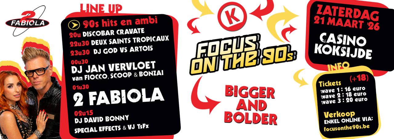 Focus on the 90s staat voor vroeg feesten en dus maximale beleving. Vroeg feesten is lang feesten. Profiteert der van! Je kan reeds vanaf 20u binnen.